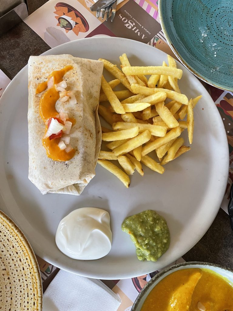 Nekem nagyon tetszett a hely kialakítása, a dekoráció, ami élénk, rikító rózsaszín, sárga és mindenféle színű volt. A bejáratnál egy hatalmas szerencsekerék fogadott minket, a mennyezetről színes lampionok lógtak le, a falakat pedig sombrero-k díszítették. Kicsit jobban tükrözte a mexikói hangulatot, habár takarítás szempontjából egy kész rémálom lehet. Vendégként viszont csodás. Kaptunk egy-egy felest is az ebéd előtt.